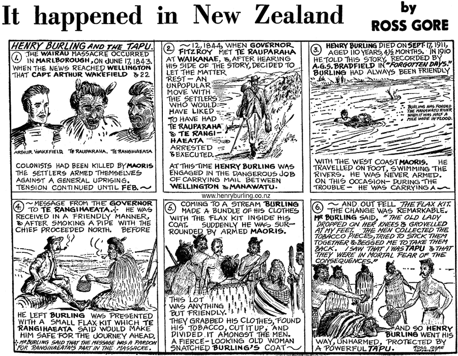 Cartoonist Ross Gore produced a series of cartoons for local newspapers under the heading 'It happened in New Zealand', describing various events in New Zealand history. The following comic strip was published in the Dominion Post newspaper in November 1966.